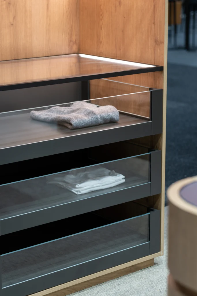 Visitors can experience the full breadth of Hettich drawer innovations, from AvanTech YOU Illumination drawer systems to the precision engineering of Actro 5D runners. The showroom also showcases the effortless movement of WingLine folding doors, the versatility of the Cadro framing system, and integrated lighting solutions, each designed to elevate how spaces look, feel and function. Hettich’s new Interior Fittings range is thoughtfully integrated throughout the cabinetry. FurnSpin is featured extensively, allowing guests to experience the unique translatory rotational movement across multiple kitchen applications.