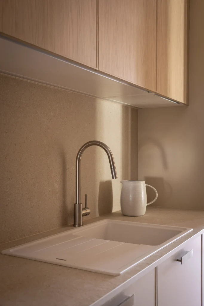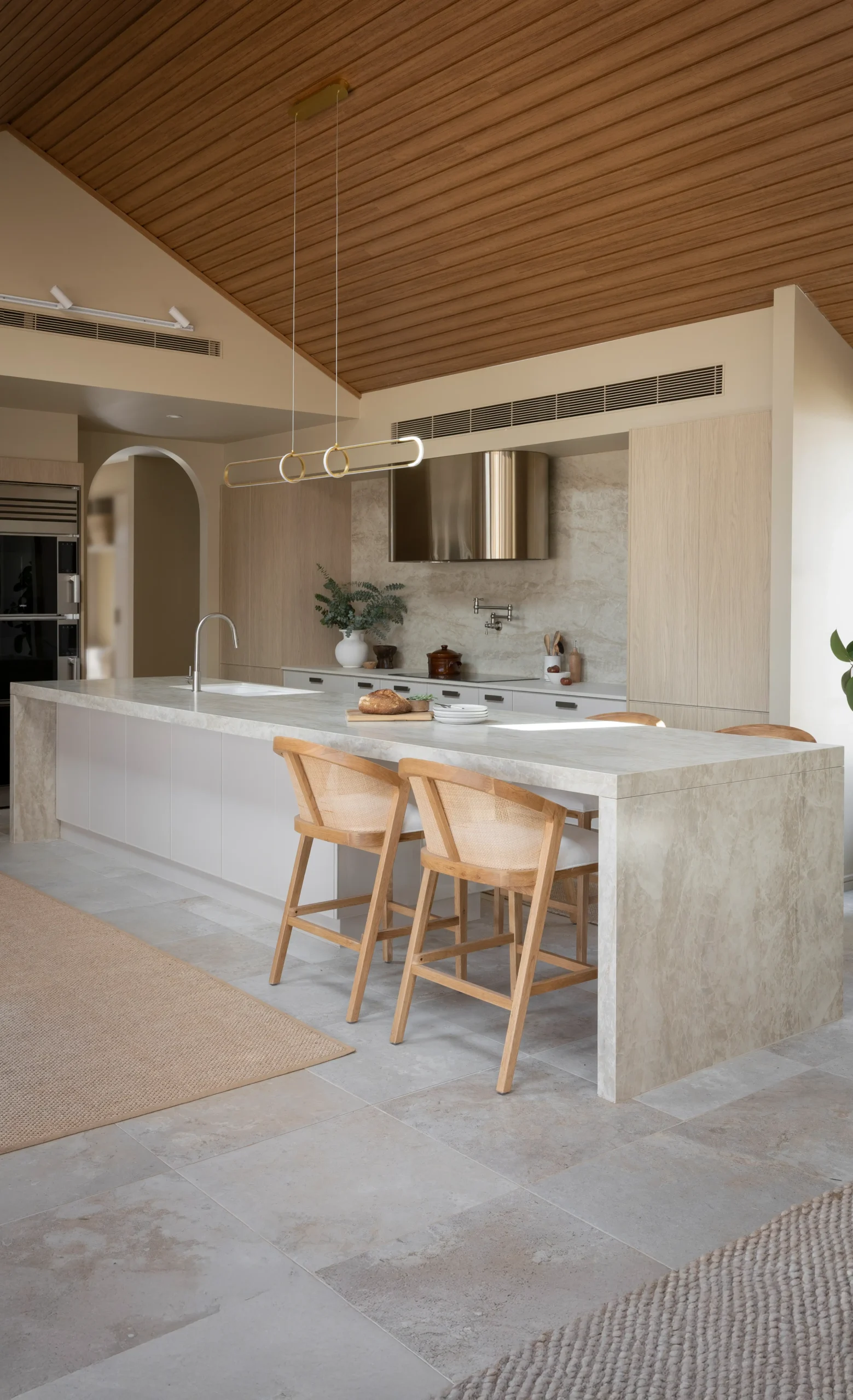 The warmth of timber is balanced with the sophistication of stone, including the showstopping Dekton Velnu by Cosentino on the kitchen island bench and splashback, complemented by Dekton Aeris on the rear benchtop. Designed with an open waterfall edge, the island bench provides generous seating space while anchoring the open-plan layout with a sense of flow and spaciousness.