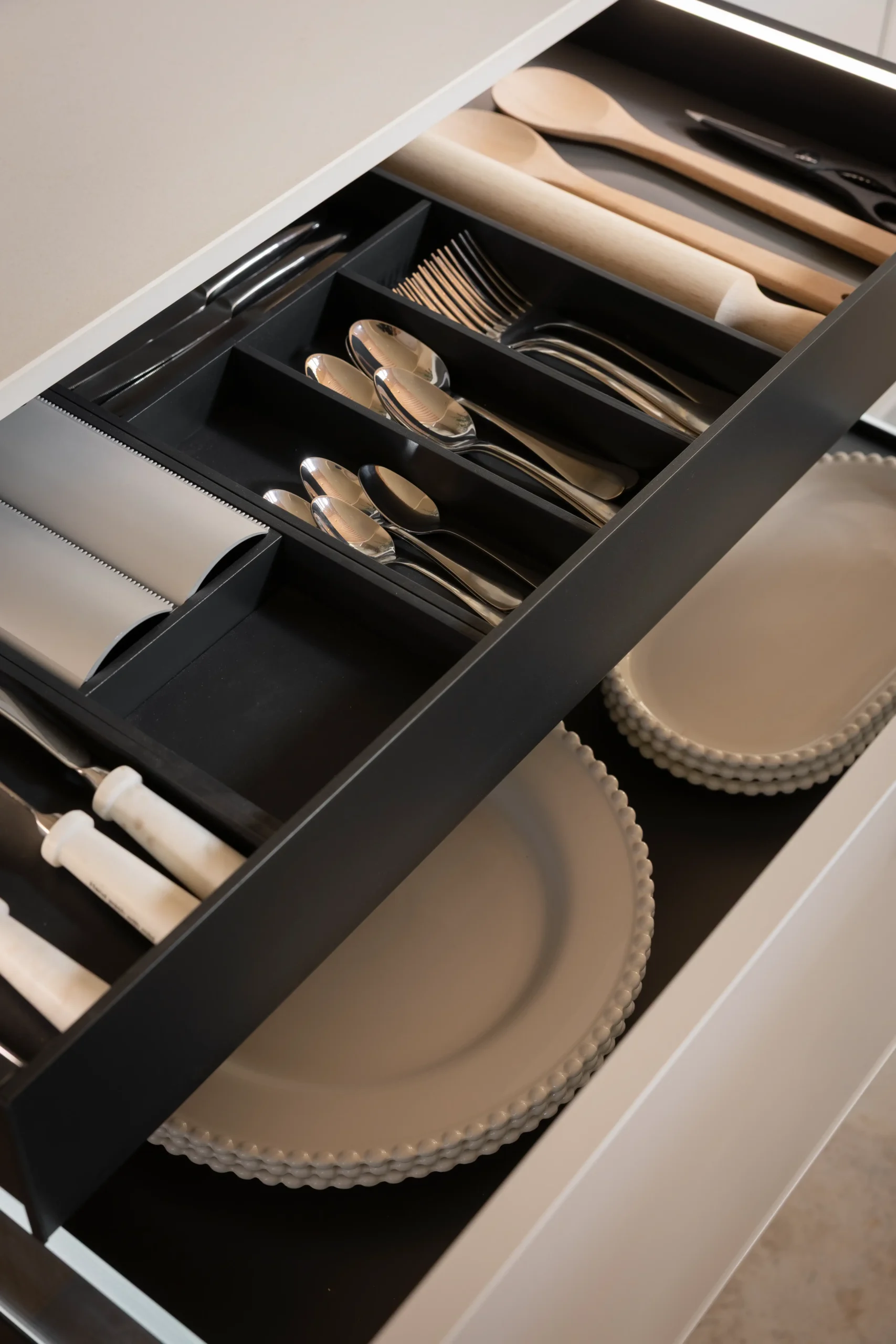 Behind the scenes, functionality is maximised with new Hettich AvanTech YOU Illuminated Drawers and Inner Drawers, Cutlery Trays with Knife Block and Foil Compartments and Non-Slip Mats.