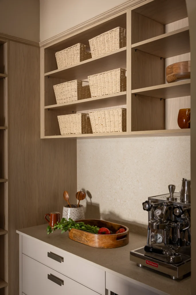 Britt and Taz’s walk-in wardrobe features two entry points from the main bedroom, creating a seamless connection between the spaces. Inspired by the bedroom’s gold wallpaper, the wardrobe carries through a warm neutral palette that feels both elegant and inviting. The design balances style with practicality, offering thoughtful storage solutions throughout. A perfectly scaled mirror enhances the sense of space. Hettich’s featured secret fingerprint-access safe was complimented by the judges.