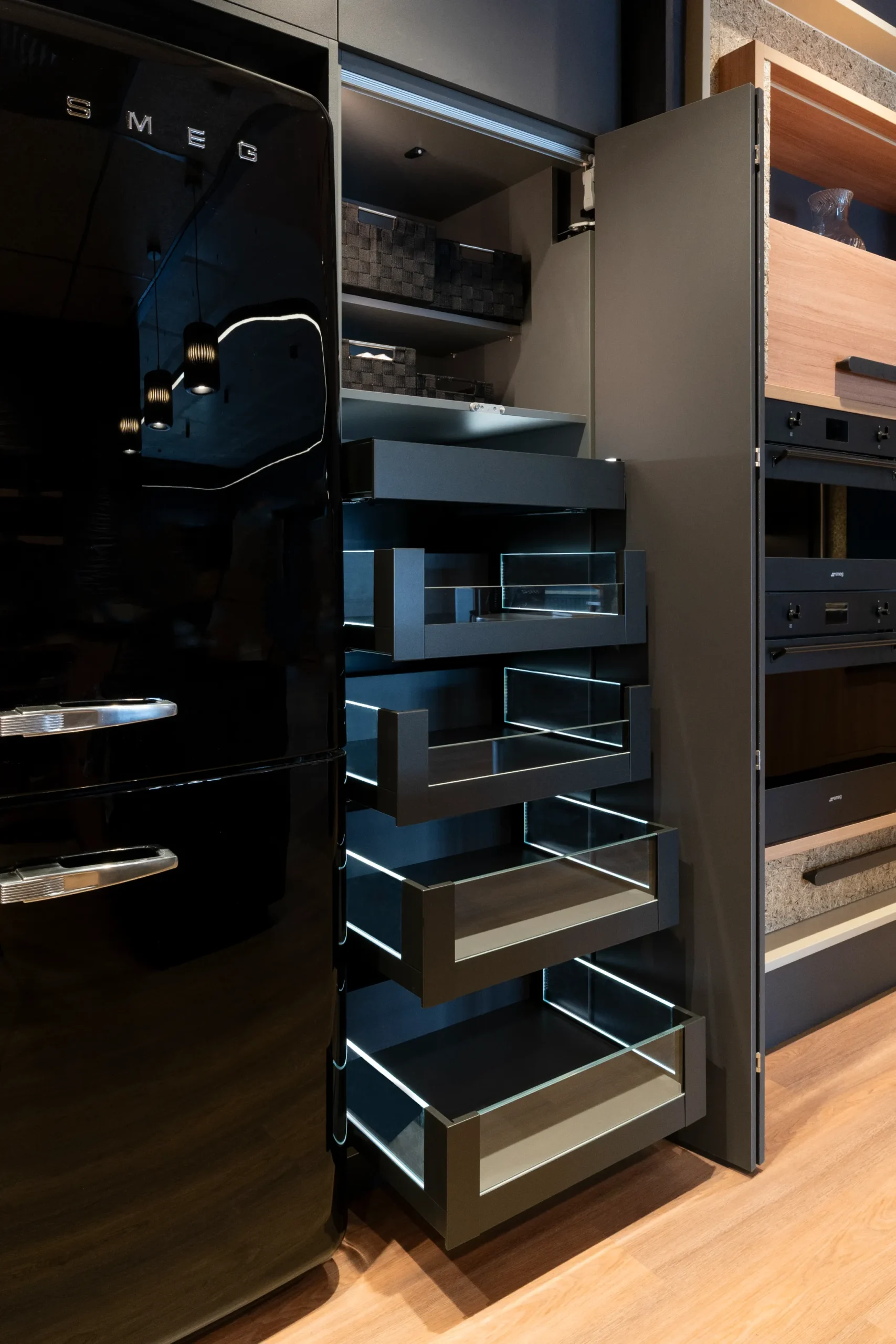 - AvanTech YOU drawers, also presented as LightTower with glass inlays and LED illumination, paired with OrgaTray interior organisation solutions to elevate utensil storage.
