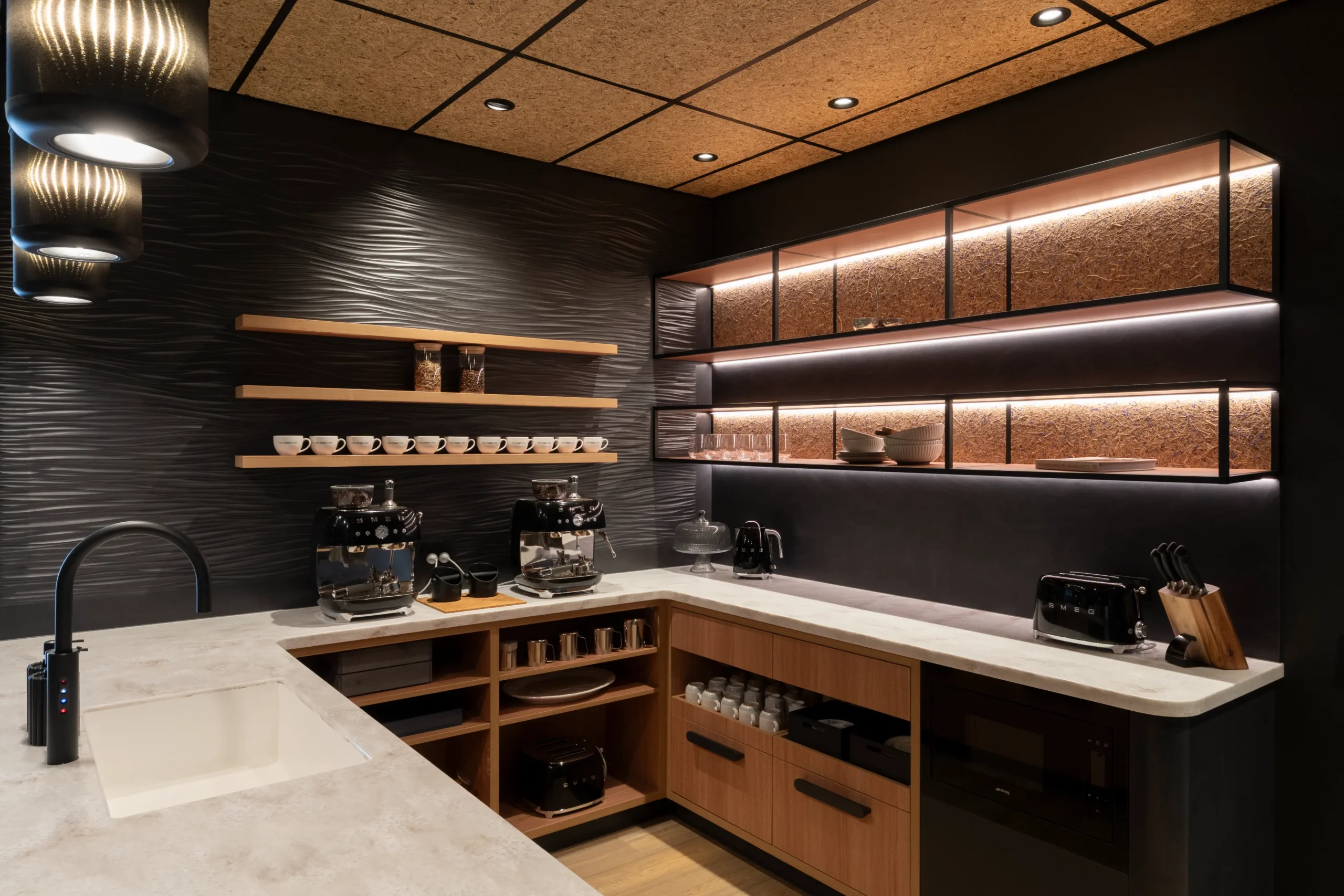 Every corner of the new facility — from offices to amenities, from display zones to event spaces — has been meticulously crafted to showcase the potential of Austaron Surfaces’ extensive product range. The space aligns perfectly with their brand ethos: Inspire. Imagine. Create.
