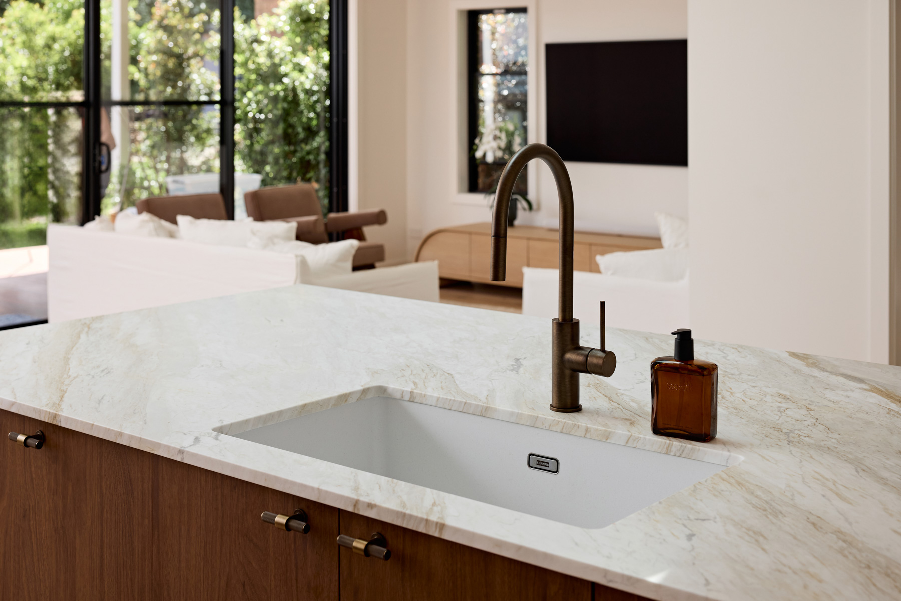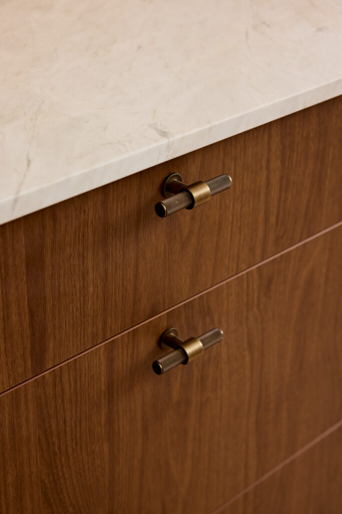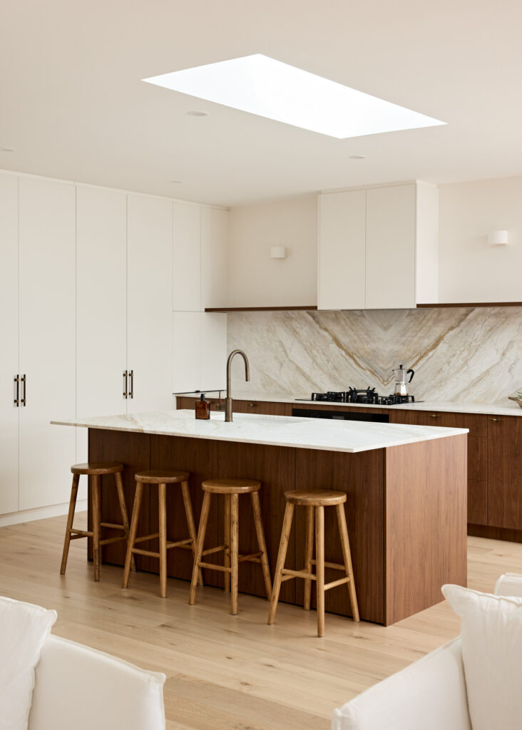 This “Warm Minimalist” aesthetic is achieved through the use of Polytec Florentine Walnut Woodmatt on the lower cabinets and island. The knurled T-knobs and bar pulls in a muted brass finish provide a jewellery-like contrast against the dark walnut. Light is also treated as a building material; while a massive skylight floods the island with natural light by day.