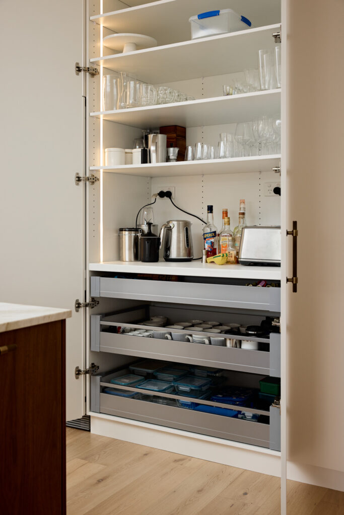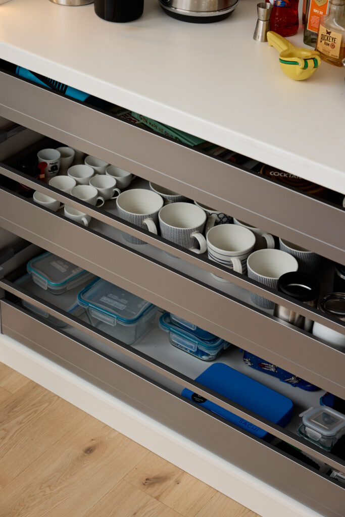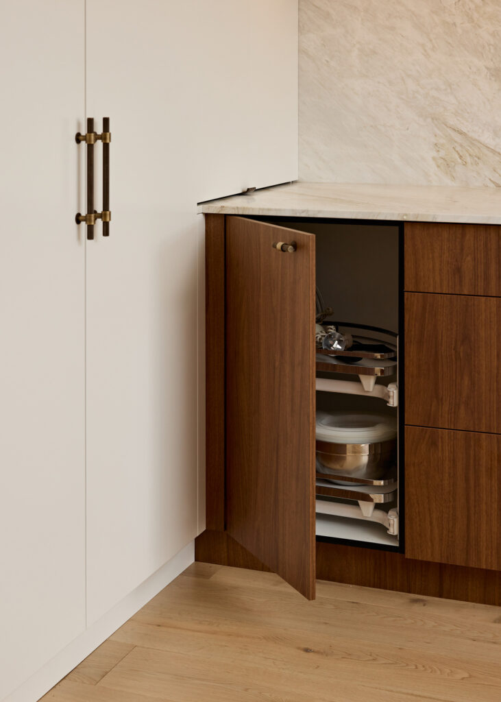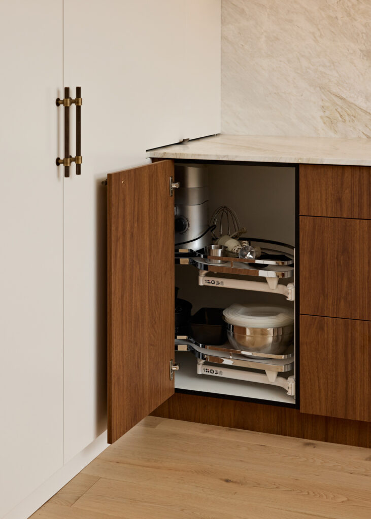 To achieve the brief of a clutter-free space, JPC Kitchens utilised innovative hardware solutions to tuck away the functional elements of a working kitchen. A standout feature is the hidden breakfast bar tucked within the cabinetry. This zone utilises Hettich InnoTech Atira internal drawers in silver for sleek, organised storage, while the doors open fully to allow for effortless access to appliances. The internal space is further elevated with natural stone benchtops and integrated lighting, ensuring the station is as beautiful as it is useful.