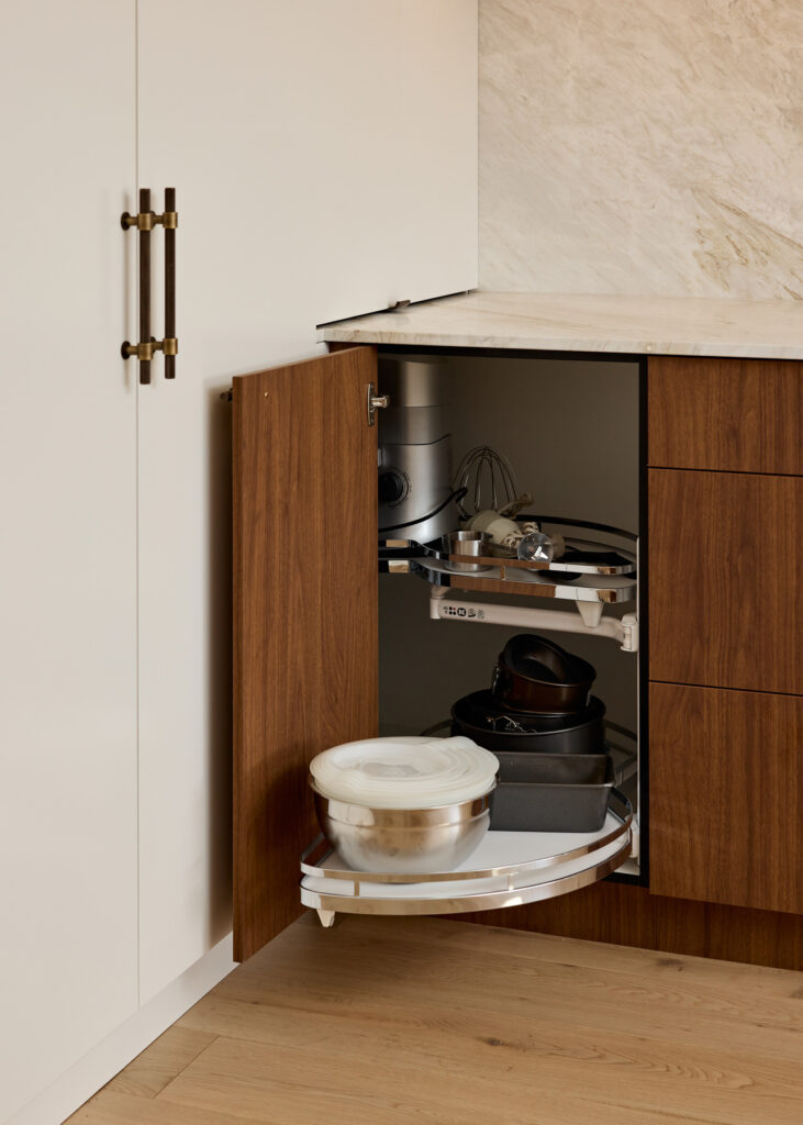 The periphery of the kitchen makes excellent use of WingLine bi-fold doors, which glide open to reveal expansive storage without obstructing the workflow. Above these units, LED strip lighting continues the architectural glow throughout the room. To ensure no space is wasted, the LeMans corner pull-out unit was installed, allowing the shelves to swing smoothly and entirely out of the cabinet, bringing heavy pots and pans into easy reach and eliminating the frustration of deep, dark corner cupboards.