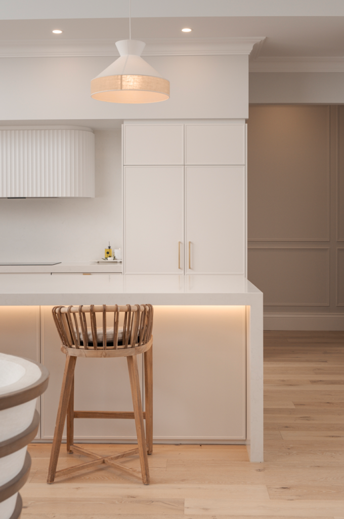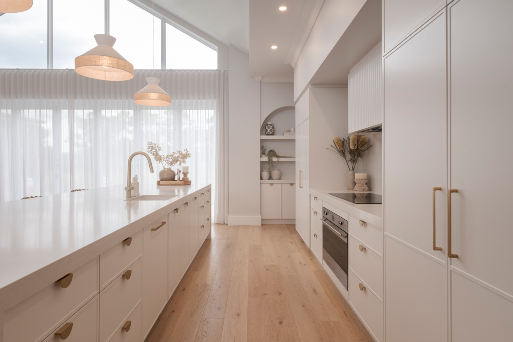 Full-height cabinetry frames the space, while a substantial central island creates both a functional workspace and a natural gathering point for family and guests. Throughout the design, a palette of soft neutral tones, warm brass accents and natural timber flooring creates an atmosphere that feels calm, welcoming and timeless.