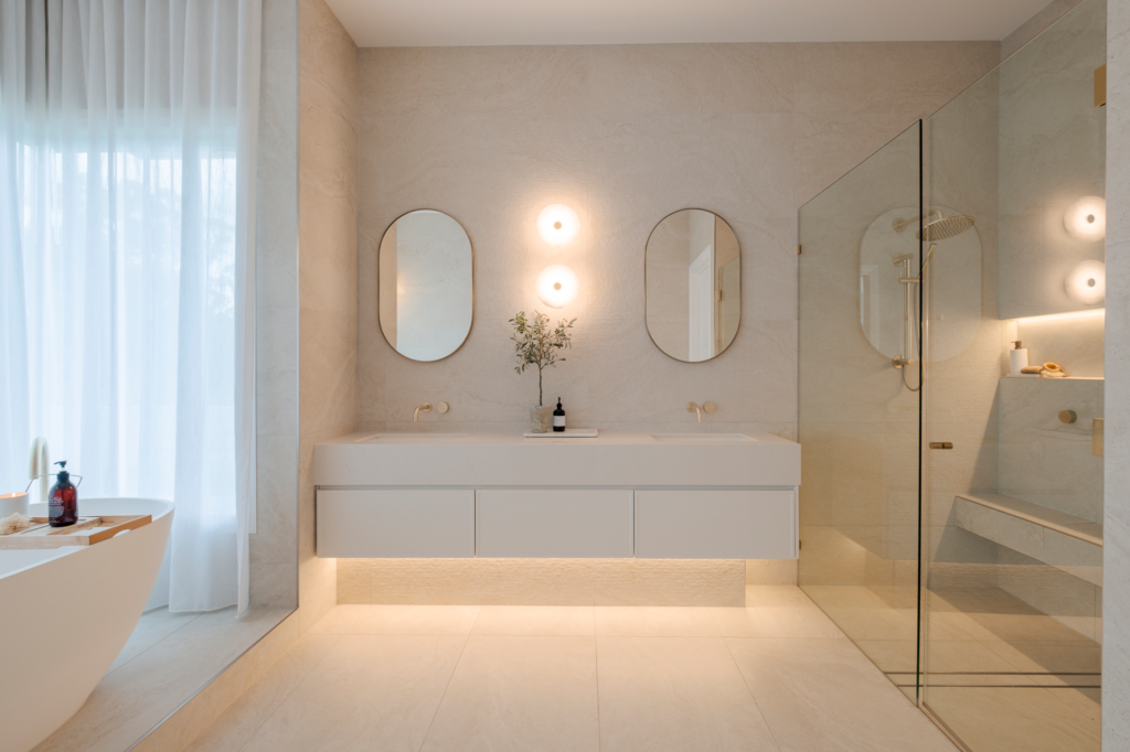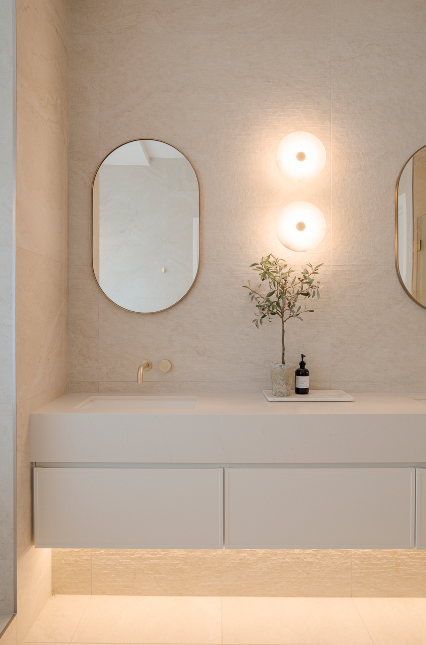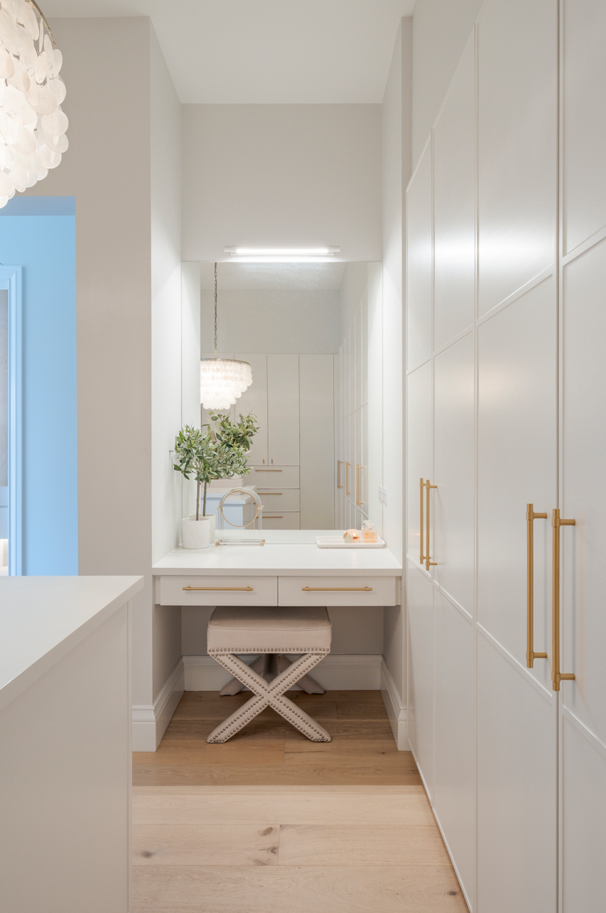 The design language established in the kitchen continues throughout the residence. Custom joinery extends into other areas of the home, including robe cabinetry and bathroom vanities, ensuring a cohesive interior narrative that flows seamlessly between spaces. This continuity reinforces the architectural vision of the home while maintaining the same attention to proportion, detailing and functionality found in the kitchen.