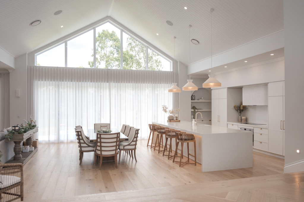 Positioned within a dramatic open-plan interior, the kitchen sits beneath soaring cathedral ceilings and expansive glazing that floods the space with natural light. The architecture demanded joinery that could match its scale while maintaining the relaxed warmth associated with coastal design. The result is a kitchen defined by generous proportions and considered detailing.