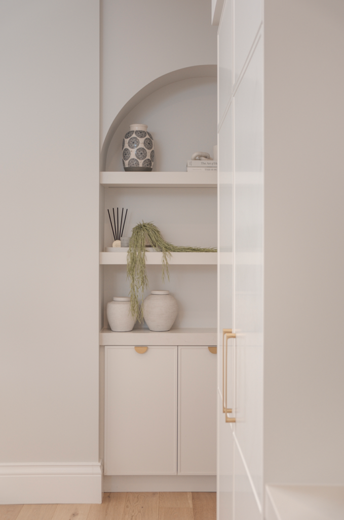 Another distinctive element is the arched recessed shelving niche, which introduces an architectural moment within the cabinetry. Beyond its functional role as a display space, the curved detail softens the overall geometry of the joinery and adds warmth and personality to the kitchen environment.