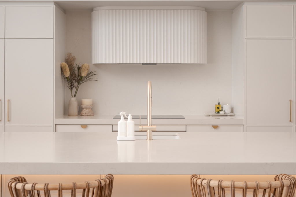 A custom fluted rangehood box forms a sculptural focal point above the cooking zone. The vertical fluting introduces texture and rhythm while maintaining the softness of the overall palette. Framed by surrounding cabinetry, the feature creates a sense of symmetry and balance within the composition.