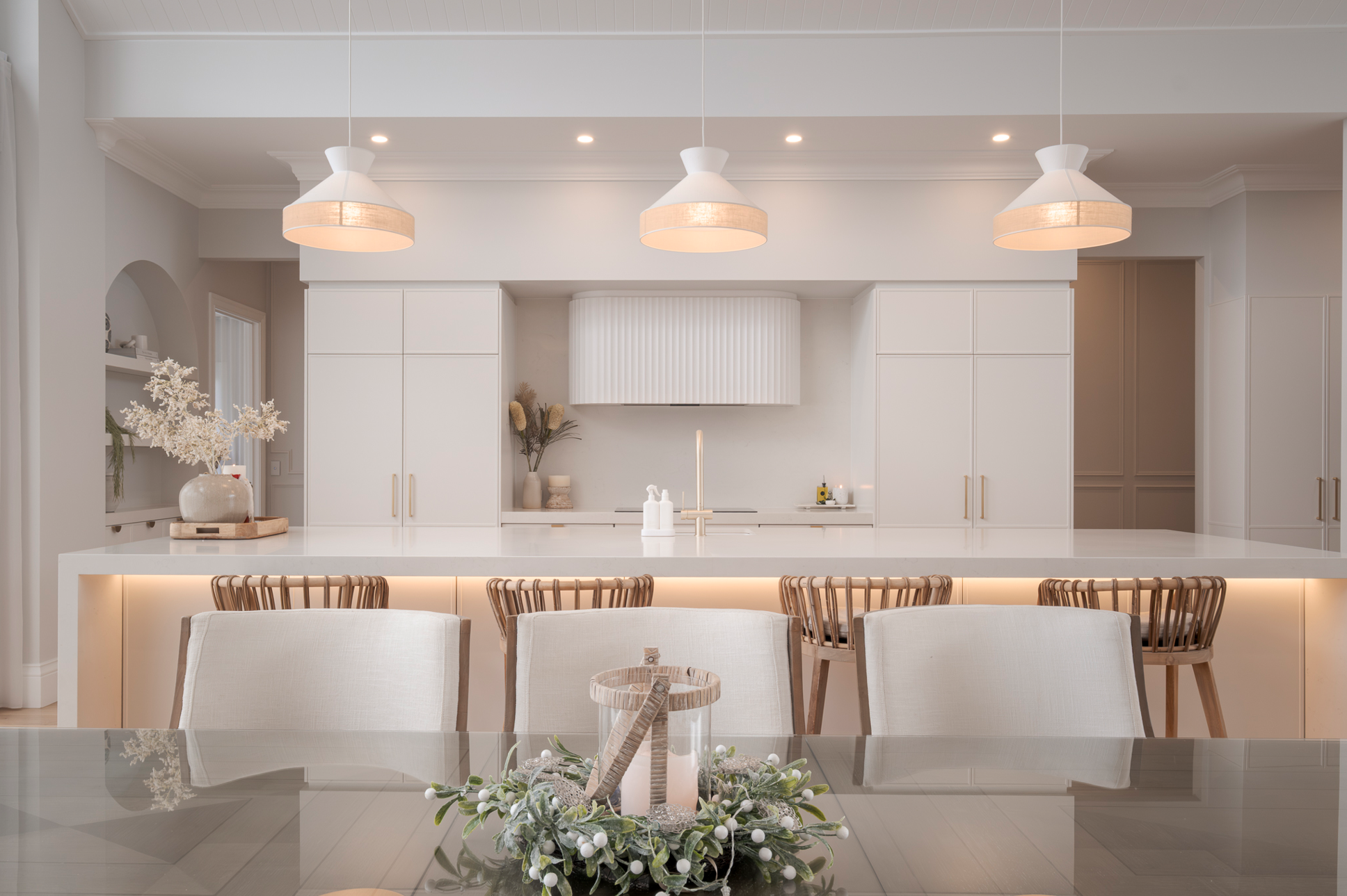 Full-height cabinetry frames the space, while a substantial central island creates both a functional workspace and a natural gathering point for family and guests. Throughout the design, a palette of soft neutral tones, warm brass accents and natural timber flooring creates an atmosphere that feels calm, welcoming and timeless.
