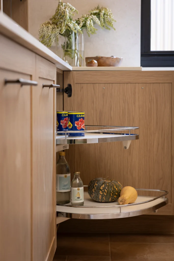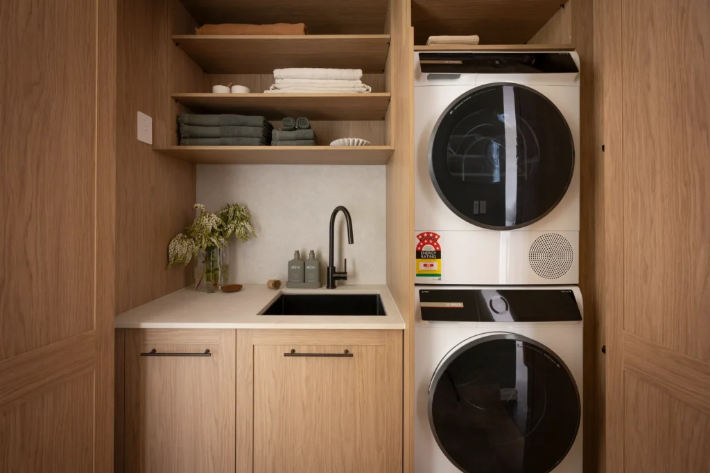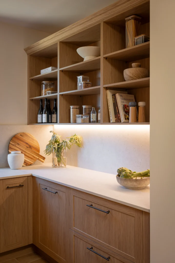 Robby and Mat’s walk-in pantry strikes the perfect balance of display and storage, combining open shelving with closed cupboards and highlighted by subtle LED strip lighting. Their laundry, discreetly concealed along the corridor behind bi-fold doors, is a clever example of compact yet efficient design. The adjoining mudroom is equally practical, featuring a built-in bench with drawers for shoe storage and open shelving above to keep everyday essentials organised.